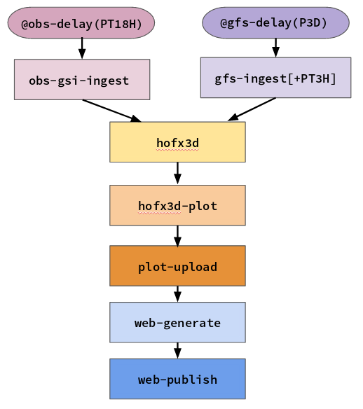 Figure 1. A simplified graphical representation of the workflow graph that implements the NRT website. Each node in the graph is a JEDI-Rapids App, which can be used independently or as part of a larger workflow.