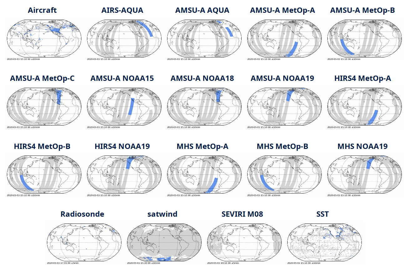 Figure 2. The JEDI NRT Observation monitoring site is updated at 6hr intervals. All operational GSI instruments with functional Unified Forward Operator (UFO) implementations are run through the system, and animated plots of locations and observation quality metrics are available.